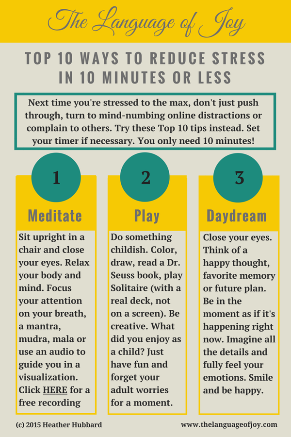 The next time you find yourself stressed out, don’t just push through, turn to mind-numbing online distractions or complain to others. Try these tips instead. Set your timer if necessary. You only need 10 minutes!